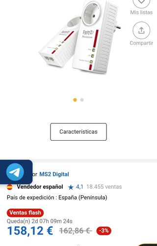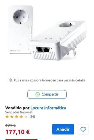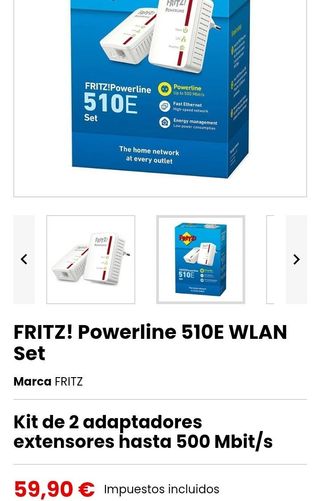 Kit FRITZ! Powerline 510E Set, nuevo. Conecta la red mediante la instalación eléctrica de tu hogar a velocidades de hasta 500 Mb/s (bruto). Incluye 2 adaptadores, cada uno con un puerto Ethernet (Fast Ethernet). Dimensiones compactas: 58 × 31 × 68 mm, peso aprox. 75 g por unidad. Funciona en 230 V/50 Hz, consumo medio: 2 W, en espera: 0,5 W. Red cifrada mediante botón “Security” (AES-128). Compatible con HomePlug AV2 e IEEE P1901. Ideal para TV, consolas, NAS o PC en ubicaciones sin cableado. Fácil de usar: Plug-and-Play.