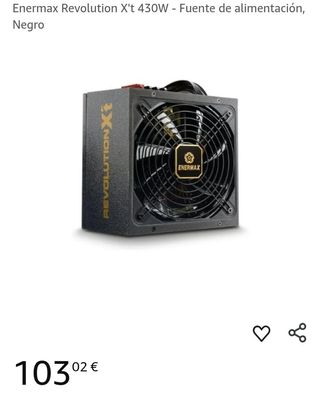 Fuente de alimentación para PC modelo Enermax Revolution X’t ERX430AWT de 430 W, certificación 80 PLUS Gold, ATX12V v2.4. Viene con sistema semi-modular y cables planos, incluyendo 2 conectores PCIe de 6+2 pines, 8 conectores SATA y conectores Molex. El ventilador de 139 mm con cojinete Twister promete buen flujo de aire y ruido contenido. Tiene un solo riel +12V de 35 A para cargas elevadas, +3.3V y +5V de hasta 20 A cada uno. Incluye múltiples protecciones (OVP, OPP, OTP, SCP). Dimensiones de 150 × 160 × 86 mm, peso aprox. 1,8 kg. Ideal para montar sistema de gama media con tarjeta gráfica, buen rendimiento y eficiencia energética