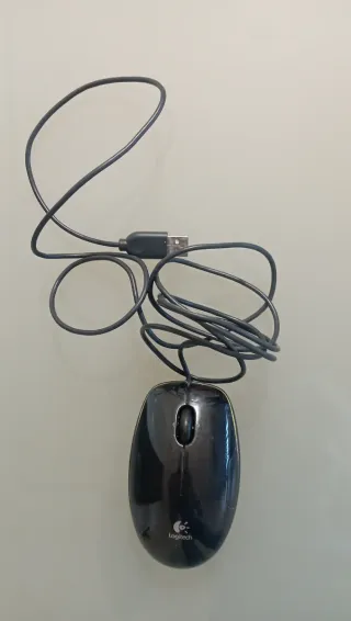 Ratón de ordenador Logitech con conexión USB. Su diseño ergonómico lo hace cómodo para el uso prolongado. - Cable USB para conexión. - Rueda de desplazamiento central. - Diseño elegante en negro con detalles amarillos.