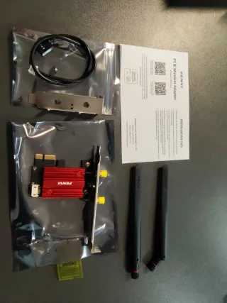 Adaptador de red inalámbrico PCIe con un diseño moderno y eficiente. - Incluye dos antenas para una mejor recepción de señal. - Componente principal con disipador de calor rojo. - Se acompaña de un cable y un soporte de montaje.