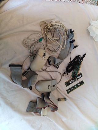 Lote de cables más tarjetas RAM , una de red y dos ratones de bola