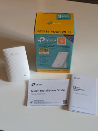 Extensor de Wi-Fi TP-Link RE200 AC750, ideal para mejorar la cobertura de tu red inalámbrica. Amplifica la señal inalámbrica perfectamente hasta zonas de la casa donde no llega o es difícil de cablear. El puerto Ethernet te permite conectar un dispositivo cableado como una Smart TV, una consola de videojuegos o un ordenador a la red Wi-Fi para disfrutar de mayor velocidad y estabilidad. Incluye la caja original y guías de instalación. - Modelo: RE200 - Estándar Wi-Fi: AC750 Dual Band - Tecnología: Mesh Wi-Fi Extender - Incluye: Extensor, su caja y guías rápidas de instalación. Poco tiempo de uso por cambio a Smart Tv.
