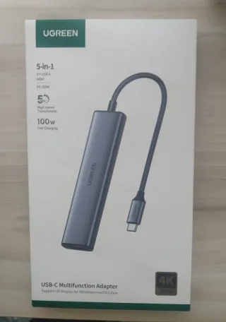 Adaptador multifunción UGREEN con conexión USB-C. Permite expandir las capacidades de tu dispositivo. - 5 funciones en 1: 3x USB-A, HDMI, PD 100W. - Transmisión de alta velocidad. - Carga rápida de 100W. - Soporta pantalla HD para Windows/macOS/Linux. - Resolución 4K a 30Hz.