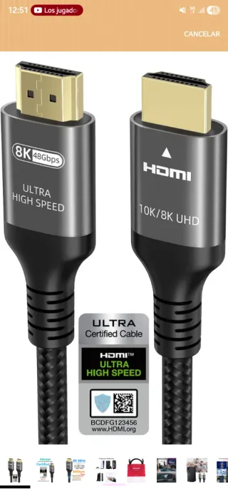 Cable HDMI de alta velocidad con certificación Ultra High Speed. - Soporta resoluciones 8K y 10K UHD. - Ancho de banda de 48 Gbps. - Conectores chapados en oro. - Cable trenzado duradero.