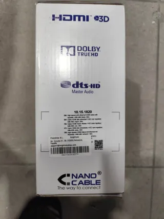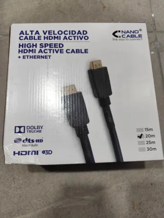 PVP: 60€ Cable HDMI activo Nanocable de 20 metros, ideal para conexiones a larga distancia sin pérdida de calidad. El artículo está nuevo, en su embalaje original (tal como se ve en la imagen). Características principales: - Alta Velocidad con Ethernet. - Versión HDMI 1.4 (compatible con 3D, Dolby TrueHD, DTS-HD). - Cuenta con repetidor de señal para garantizar una conexión estable en los 20m. - Perfecto para instalaciones de proyectores, sistemas de cine en casa o monitores profesionales.