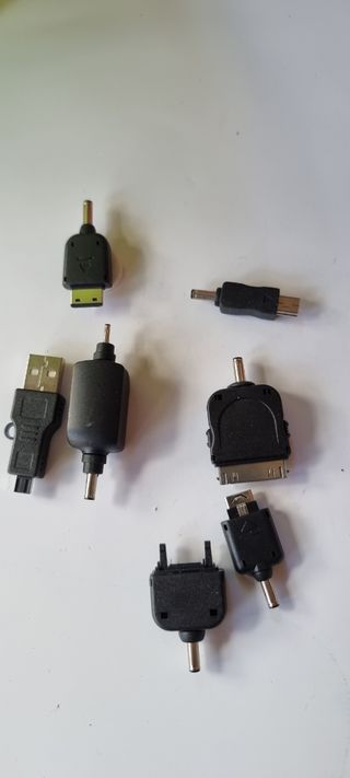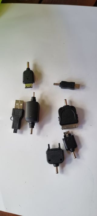 Conjunto de varios conectores para dispositivos electrónicos. - Incluye adaptadores USB a micro USB. - Adaptadores de carga. - Conectores de diferentes tipos.