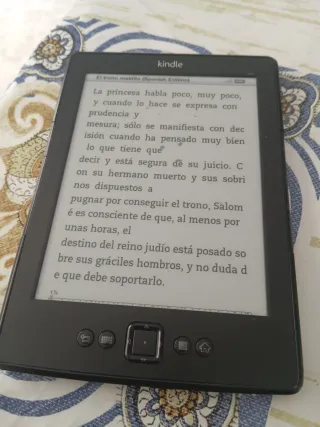 Dispositivo de lectura Kindle en color negro. Funciona bien. Tiene unas manchitas en la pantalla que se pueden ver en las fotos, pero no interfieren en su funcionamiento. No incluye cable pero vale cualquier micro USB