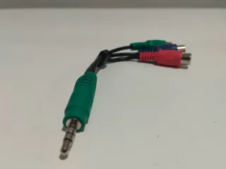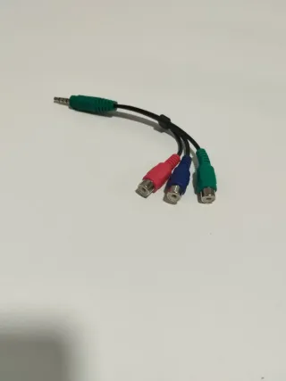 Adaptador de cable con conector jack de 3.5mm a tres conectores RCA (rojo, azul, verde). - Conector jack de 3.5mm (TRRS). - Tres conectores RCA para audio y video. - Cables codificados por color para fácil conexión.