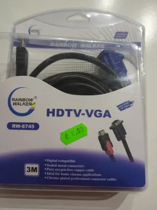 Cable de conexión HDTV a VGA de la marca Rainbow Walker. Ideal para conectar dispositivos de alta definición a pantallas con entrada VGA. - Compatible con señal digital. - Conectores metálicos sellados. - Cable de cobre libre de oxígeno. - Apto para aplicaciones de cine en casa. - Conectores profesionales chapados en cromo.