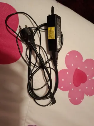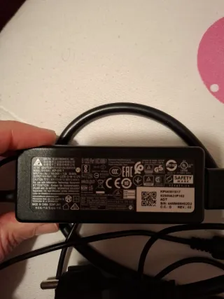 Adaptador de corriente para ordenador portátil. - Cable de alimentación con enchufe europeo. - Transformador negro. - Conector de salida.