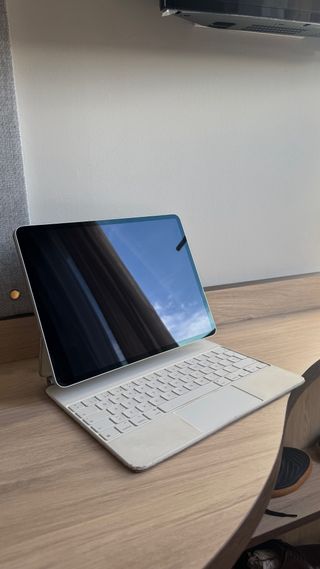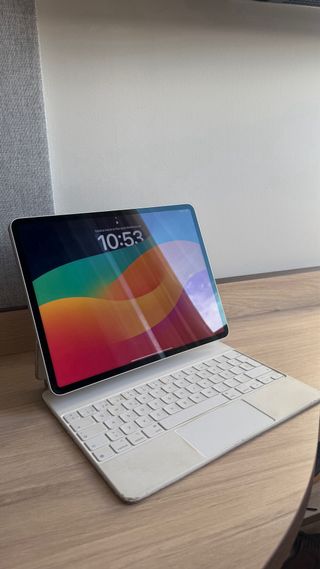 Venta por cambio a ordenador. Se trata del modelo iPad Pro de 12,9 pulgadas (6.ª generación) con chip M2 y 512GB de almacenamiento. Ideal para diseño, edición de vídeo o gestión profesional. Dimensiones y peso: Ancho: 21,49 cm, Alto: 28,06 cm, Grosor: 0,64 cm y Peso: 682 g. El pack incluye: iPad Pro 12.9" M2 512GB (Plata) con garantía hasta 30/01/27 Apple Pencil (2.ª generación): En perfecto estado, con puntas de repuesto originales incluidas. Magic Keyboard (Blanco): Teclado retroiluminado y trackpad. Tiene el desgaste estético típico del uso en el color blanco. Cargador completo (cable USB-C algo dañado por un lado)