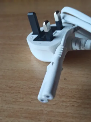 cable de alimentación blanco con enchufe tipo G (estándar británico) y conector IEC C7