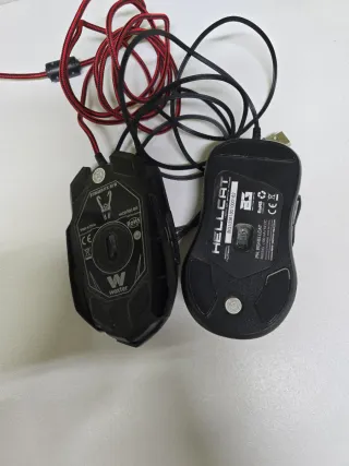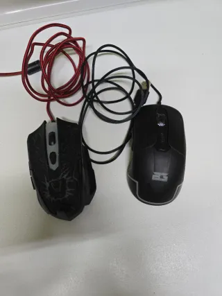 Se venden dos ratones de ordenador con cable. - Un ratón es negro con detalles en rojo. - El otro ratón es completamente negro. - Ambos ratones tienen cable.