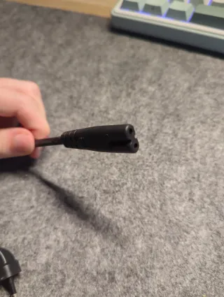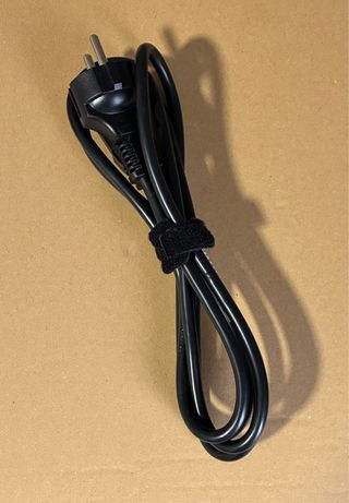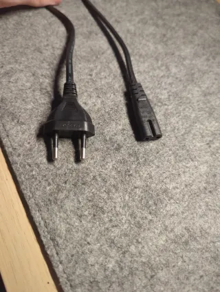 Cable de alimentación de corriente alterna (CA) en color negro. Es un cable estándar para conectar dispositivos electrónicos a la red eléctrica. - Conector de entrada tipo C (Schuko). - Conector de salida tipo C7 (figura de 8).