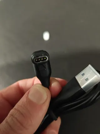 Cable de carga y datos para dispositivos Garmin. - Conector USB estándar. - Conector angular específico para Garmin.