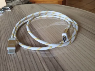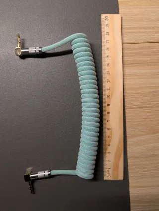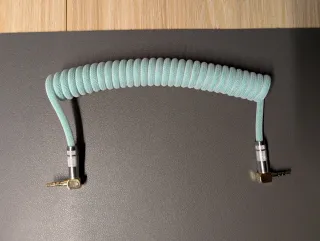 Cable para teclado dividido (split keyboard), tipo TRRS (jack 3,5 mm). Cable nuevo, no ha sido utilizado: resultó ser demasiado grande para mi escritorio, ya que tengo poco espacio. Cable de alta calidad, grueso y con recubrimiento/forro muy resistente. Diseño en espiral (coiled), flexible y duradero. Conectores en ángulo (90°) en ambos extremos. Compatible con los teclados split que utilizan conexión TRRS.