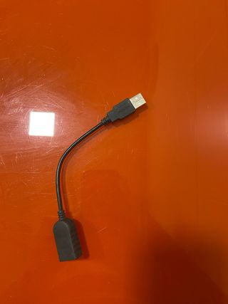 Cable para impresora con conector USB y un adaptador adicional. - Conector USB tipo A. - Conector tipo Mini-USB B (posiblemente). - Adaptador con pin morado.