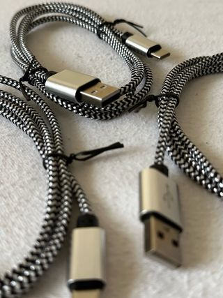 Conjunto de cables USB Tipo C con un diseño trenzado y conectores metálicos. - Cable USB a USB-C. - Cable USB a Lightning. - Cable USB a Micro USB. - Diseño trenzado duradero. - Conectores metálicos plateados.