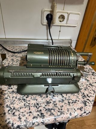 Calculadora mecánica antigua de la marca Minerva, fabricada en los años 50. Un objeto de colección con un diseño industrial clásico. - Cuerpo metálico en color verde. - Mecanismo visible con palancas y ruedas. - Inscripción MINERVA en el lateral.