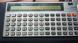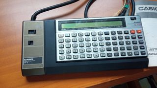 Calculadora programable con funda original, instrucciones, teclado numérico, operaciones aritmética, calculadora científica, pantalla de texto de 20 caracteres, 1680 pasos de memoria. Dispositivo Adaptador FA-2 Casio para realizar copias de seguridad en cinta. Años 80 una de las computadoras de bolsillo Casio más famosas y antiguas. La única con este teclado alfabético.