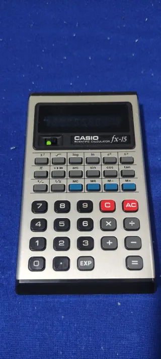 Calculadora científica Casio FX-15, un modelo clásico para coleccionistas. - Diseño retro plateado. - Teclas con funciones científicas.