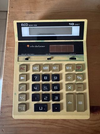 Calculadora vintage ELCO EOM-10G con doble alimentación solar y de batería. - Diseño de 10 dígitos. - Pantalla LCD. - Teclas numéricas y de función. Más artículos en mi perfil, no dudes en preguntar!