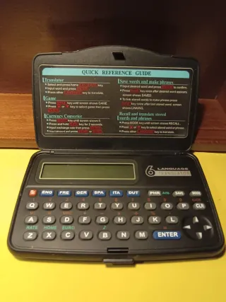 Traductor electrónico portátil con funciones de calculadora y juegos. Ideal para coleccionistas de tecnología retro. - Pantalla LCD. - Teclado QWERTY. - Incluye guía rápida de referencia.