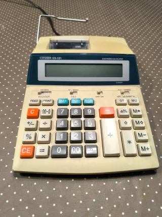 Calculadora electrónica vintage Citizen CX-121. - Diseño clásico en color beige. - Pantalla digital de 12 dígitos. - Teclas con funciones básicas y avanzadas.