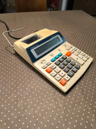 Calculadora impresora vintage de la marca Precisa, de origen suizo. Un diseño retro con un acabado en tonos grises y beige. Está sucia de todos estos años sin usar, pero está en buen estado, es solo polvo, sale con un paño, pero no tengo tiempo ni pa eso.. - Teclado numérico con teclas rojas y negras. - Rollo de papel para impresión. - Diseño compacto y robusto.
