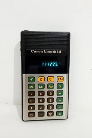 Calculadora electrónica Canon Palmtronic 8M de estilo vintage. Un modelo clásico para coleccionistas o para uso. - Diseño compacto y portátil. - Pantalla digital. - Teclado numérico y de funciones.