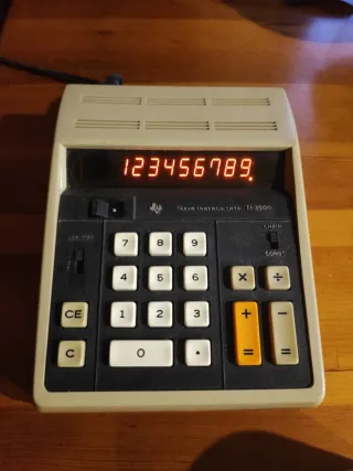 Calculadora vintage de los años 80, modelo TI-3500 de Texas Instruments. Un clásico para coleccionistas o para quienes buscan un diseño retro. - Pantalla LED naranja. - Teclado numérico y de funciones. - Adaptador de enchufe americano