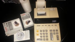 Pequeña calculadora muy práctica. Eléctrica: 230V, 12 W. Incluyo un cartucho de tinta CJ-3A "para uso en las calculadoras-impresoras tipo Canon Tipo Bubble jet". También incluyo varios rollos de papel (no es papel térmico) JP5711