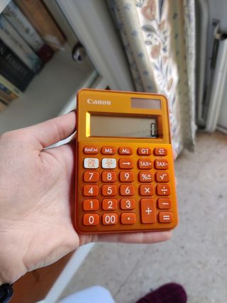 Calculadora naranja k series mini de Canon modelo LS-100K con batería solar. Usada pero conserva su caja con su manual y todo. Funciona perfectamente.