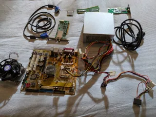 Lote de componentes de mediados de los 2000, ideal para restauraciones o coleccionismo. El pack incluye todo lo que se muestra en las fotos: - Placa Base: ASUS P5VD2-VM (Socket LGA775). Una placa muy fiable y buscada para sistemas vintage. - Procesador: Intel (Socket 775) con su disipador y ventilador original. - Memoria RAM: Módulo DDR2 incluido. - Fuente de Alimentación: Formato ATX con conectores para discos IDE/SATA. - Tarjetas de Expansión: Incluye tarjeta de red/Wi-Fi y una tarjeta capturadora/módem de la época. - Cables: Cable de vídeo VGA y cable de alimentación de pared. Se vende lote completo, no piezas sueltas.