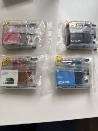 cartuchos de tinta jarbo. compatibles con Impresoras Brother de la serie DCP/MFC/J que aceptan LC123XL. 12 negros 2 azules 3 amarillos 3 rojos se venden todos por 50 euros o a 4 euros la unidad