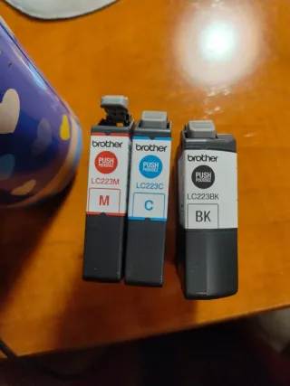 Lote de cartuchos de tinta para impresora Brother. - Cartucho negro (BK) LC223BK. Nuevo - Cartucho cian (C) LC223C. Un poco gastado - Cartucho magenta (M) LC223M.un poco gastado