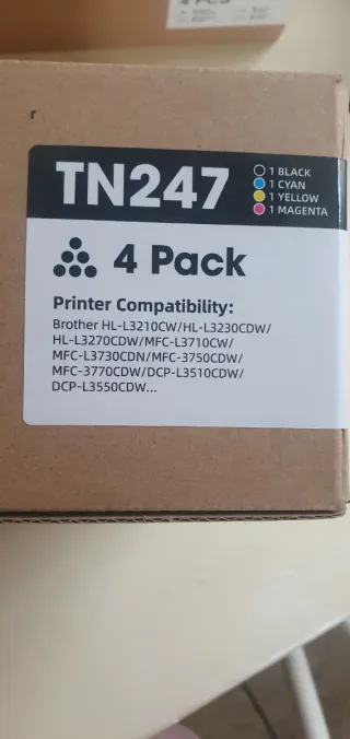Pack de 4 cartuchos de tóner compatibles con impresoras Brother. - Modelo: TN247 - Incluye: 1 negro, 1 cian, 1 amarillo, 1 magenta. - Compatibilidad: Brother HL-L3210CW/HL-L3230CDW/HL-L3270CDW/MFC-L3710CW/MFC-L3730CDN/MFC-3750CDW/MFC-3770CDW/DCP-L3510CDW/DCP-L3550CDW.