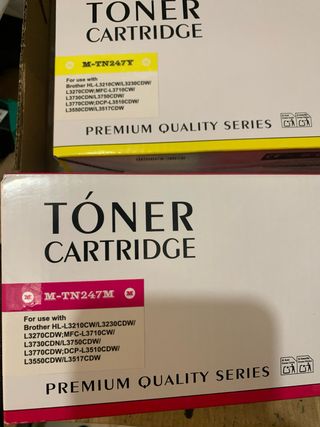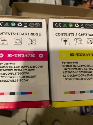Cartuchos de tóner compatibles con Brother. - Modelo: TN247M (Magenta) y TN247Y (Amarillo). - Contenido: 1 cartucho por caja. - Compatibles con modelos Brother HL-L3210CW, L3230CDW, L3270CDW, MFC-L3710CW, L3730CDN, L3750CDW, L3770CDW, DCP-L3510CDW, L3550CDW, L3517CDW.