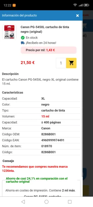 Cartucho de tinta negro original Canon PG-545XL. - Color: Negro - Tipo: Cartucho de tinta - Capacidad: XL - Volumen: 15 ml. Se compró por error, no el el de mi impresora, y al tirar el ticket , el fenómeno de mi marido, no lo puedo cambiar ( el cartucho, no el marido). Sin abrir, comprado esta semana. Costó en el Corte Inglés 24 euros.