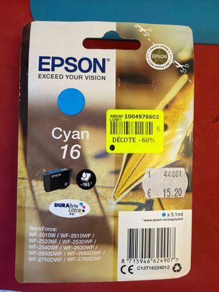 Cartucho de tinta Epson Cyan 16, modelo C13T16224012. - Color: Cyan - Modelo: 16 - Tecnología de tinta: DuraBrite Ultra Ink - Compatible con modelos WorkForce: WF-2010W, WF-2510WF, WF-2520NF, WF-2530WF, WF-2540WF, WF-2630WF, WF-2650DWF, WF-2660DWF, WF-2750DWF, WF-2760DWF. - Contenido: x 3.1ml nuevo precio no negociable
