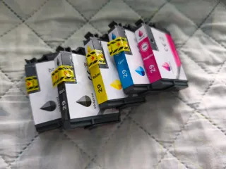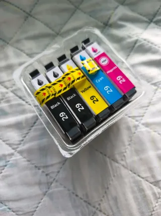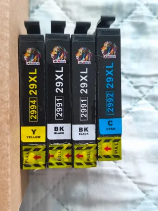Pack de cuatro cartuchos de tinta 29XL. - 2 cartuchos negros (BK). - Cartucho cian (C). - Cartucho amarillo (Y) Se venden porque me cambié de impresora y ya no me valen. Están sin estrenar y están con el precinto.