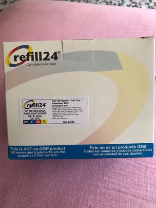 Kit de recarga para cartuchos HP 21/21XL 22/22XL. Otras compatibilidades en foto. Negro, cyan, magenta y amarillo. Nuevo con embalaje original y todos los utensilios sin abrir. No llegué ni a empezarlo porque se me rompió la impresora.