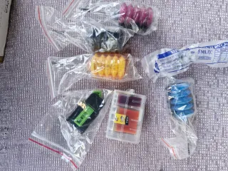 Kit de tintas para impresora, incluye varios colores. - Tintas envasadas individualmente. - morado, negro, naranja, rojo, azul. - Incluye jeringuillas y un cartucho. - Empaquetado para su conservación. Compatible con brother, Canon, epson, hp 302 301 652,901