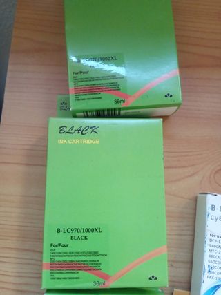 Se venden 8 cartuchos de tinta para impresora. Son compatibles con los modelos LC970 y LC1000. Los cartuchos están nuevos, sin abrir, en sus cajas originales. - Incluye 3 cartuchos de tinta negra. - Modelo: B-LC970/1000XL. - Capacidad: 36ml. - Para impresoras Brother DCP-J series, MFC-J series, y FAX-J series. Y 2 cyan ,2 magentas y 1 amarillo. Algunas cajas están manchadas de tinta de cartuchos antiguos, pero están todos sin abrir