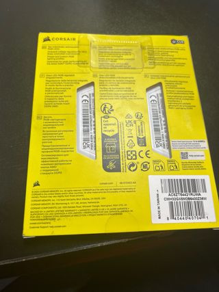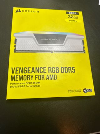 Módulo de memoria RAM Corsair Vengeance RGB DDR5 de 32GB. - La caja tiene dos tarjetas - Capacidad: 32GB - Tipo de memoria: DDR5 - Velocidad: 6400MHz - Compatible con Intel XMP y AMD EXPO
