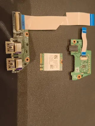Lote de componentes originales extraídos de portátil HP 15s-eq1050ns. Incluye módulo WiFi, placa de puertos USB y placa de entrada de audio, con sus cables flex. En buen estado y funcionando antes del desmontaje. Compatibles con otros modelos HP y portátiles similares (revisar referencias). Ideal como repuesto.