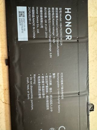 Batería de polímero de litio recargable para portátil Honor x14 - Modelo: HB4792Z9ECW-22A - Capacidad nominal: 7330mAh/56Wh - Voltaje nominal: 7.64V - Voltaje de carga limitado: 8.8V - Fabricado en China - Fecha de fabricación: 2021-11-10