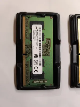 Se venden dos módulos de memoria RAM Samsung, por 55 €. Precio de unidad 30 €/unidad. - Capacidad: 8GB cada uno. - Tipo: DDR5 SODIMM. - Velocidad: PC5-48000. - Modelo: M425R16B4BB0-COKOL.