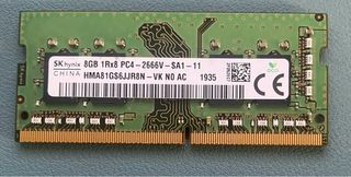 Vendo Memoria RAM SODIMM SK Hynix 8GB 2666MHz HMA81GS6JJR8N-VK, proviene de un portatil HP al que le amplié la memoria RAM. Funciona correctamente.