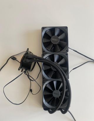 LEER BIEN, Kit de refrigeración líquida NZXT Kraken X73 con tres ventiladores, uno de los ventiladores como se puede apreciar en la foto ha sido sustituido, además un par de celdas de la refrigeración se han dañado al atornillar uno de los ventiladores, no se prueba, no se si pierde líquido, se vende así. Se entrega otro ventilador de recambio - Radiador de 360mm. - Tubos trenzados. - Bomba con iluminación. - Ventiladores de 120mm.